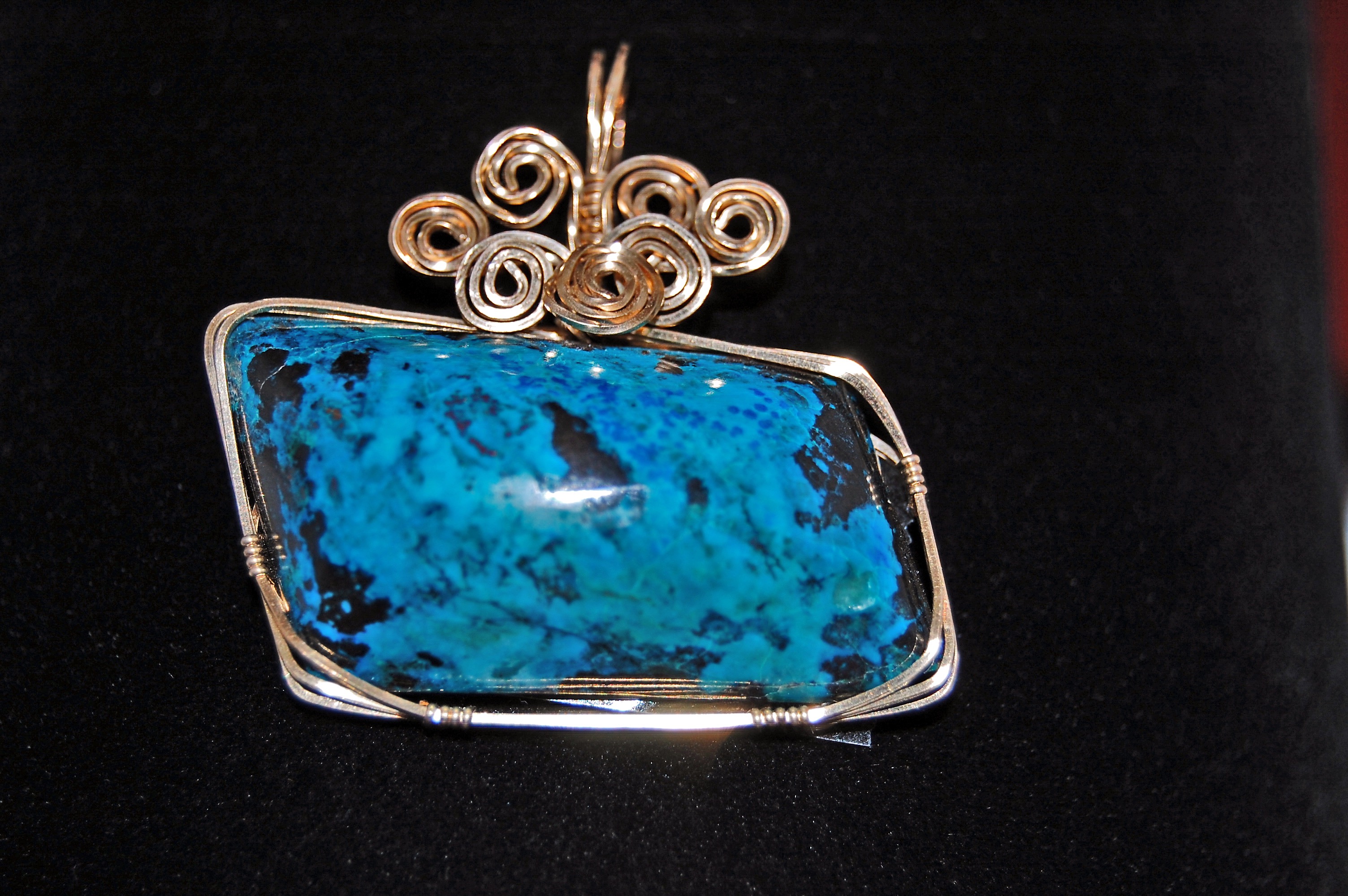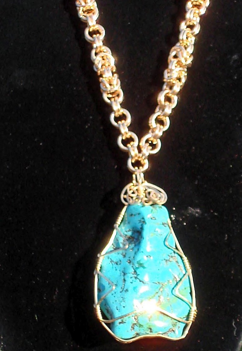 In 2000 Carolyn and her former partner were hiking a year round stream in Patagonia when they discovered some small blue stones in the water. That discovery led to filing mining claims for turquoise and then to creating jewelry around the turquoise that they mined for relaxation and enjoyment. Their artistic expressions grew to include other media.